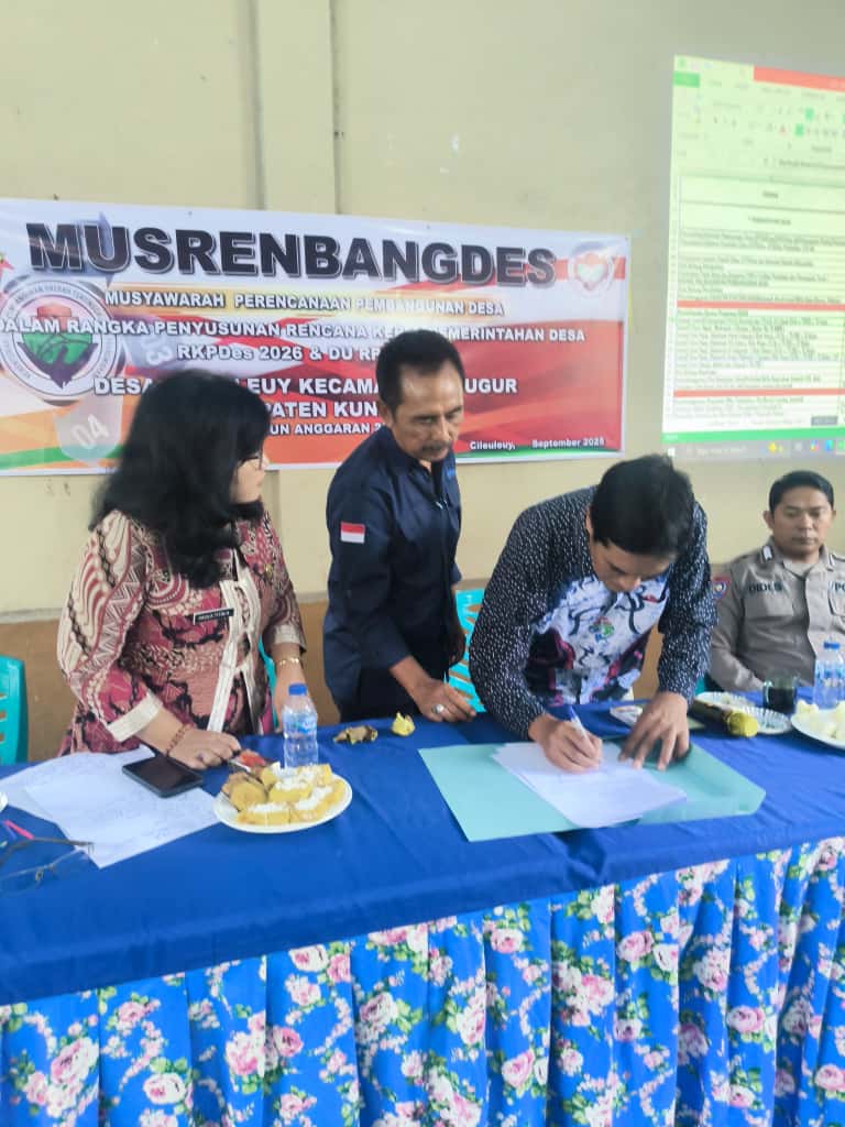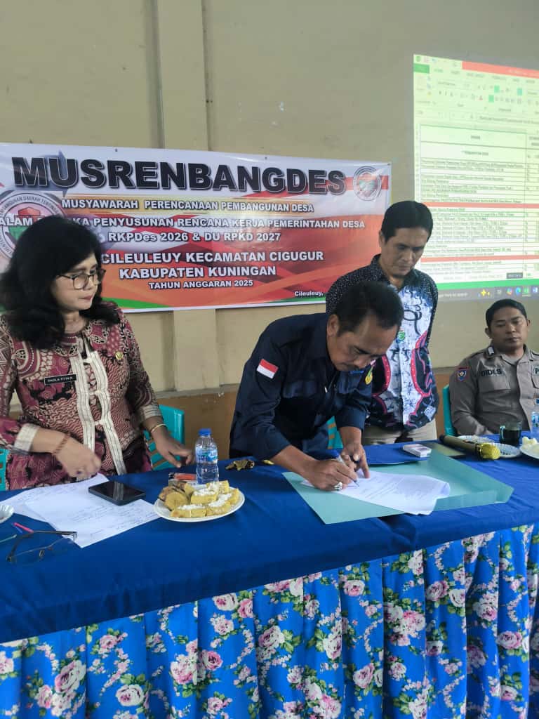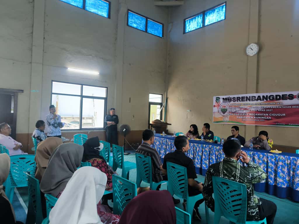 Cileuleuy - Cigugur, Dalam rangka penyusunan anggaran Tahun 2026, Pemerintah Desa Cileuleuy menyelenggarakan kegiatan Musyawarah Rencana Pembangunan Desa (MusrenbangDes) untuk menyusun Rencana Kerja Pemerintah Desa (RKPDes) Tahun 2026. Kegiatan ini melibatkan undangan dari berbagai lapisan masyarakat Desa Cileuleuy sebagai bentuk transparansi dan musyawarah kepada seluruh lapisana masyarakat dalam rangka menyambut datangnya tahun anggaran 2026 yang sebentar lagi akn kita songsong. Kegiatan Musrenbang ini dihadiri oleh Tim dari Kecamatan cigugur yang dinahkodai oleh Ibu Kasi PPM Kecamatan yaitu Ibu Paola Titin Rustini, S.AP beserta jajaran yang menyertainya.